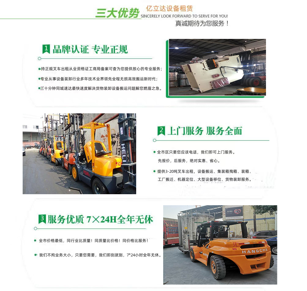 亿立达设备租赁有限公司是工商局准许的唐山曹妃甸区专业叉车出租公司,公司本着诚信、服务、效率、创新的经营理念,用精湛的技术,真诚的服务,为众多客户提供优质的服务,同时获得信赖与支持。专业提供唐山曹妃甸区3-20吨叉车出租、叉车租赁、设备搬运、集装箱掏箱装箱、机器移位定位、货物装卸、工厂搬迁、安全可靠,收费透明,价格便宜,随叫随到,24小时上门服务!本公司叉车吊车师傅对各种设备搬运装卸都有深刻探讨和研究。很多的疑难设备搬运,通过我公司的叉车师傅都能迎刃而解。对各种进口设备、国产机器、大型设备搬迁、高难度搬迁、各种精密仪器、医疗设备、科研设备等都能搬运; 提供全市 24 小时上门装卸搬运服务。同时提供厂房搬迁服务。 ...